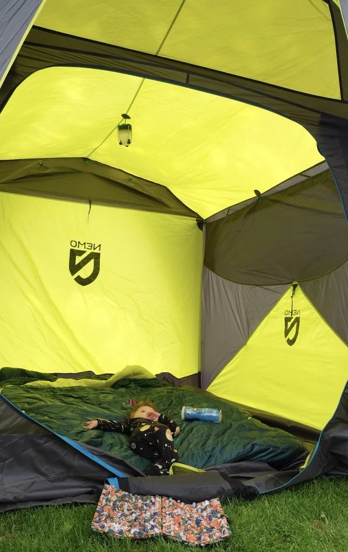 The unique pole structure creates near-vertical walls, maximizing headroom and livable space. We had plenty of room for our playpen (which helped with our feral toddler and unwanted midnight visits). We were also able to keep most of our gear inside, which was perfect because everything stayed warm and accessible. Plus, the oversized door makes it easy to get in and out, even in the middle of the night, and the vestibules provided extra storage for muddy boots. We even laid out our Nemo Chipper pads as door mats.